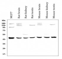 Western blot: 50 µg of sample under reducing conditions. MCF7, Rat brain, Rat kidney, Rat testis, Mouse brain, Mouse kidney and Mouse testis lysates stained with ARG43038 anti-WWOX antibody at 0.5 µg/ml dilution, overnight at 4°C.