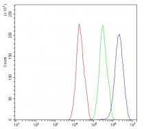 Flow Cytometry: HepG2 cells were blocked with 10% normal goat serum and then stained with ARG58824 anti-XBP1 antibody (blue) at 1 µg/10^6 cells for 30 min at 20°C, followed by incubation with DyLight®488 labelled secondary antibody. Isotype control antibody (green) was rabbit IgG (1 µg/10^6 cells) used under the same conditions. Unlabelled sample (red) was also used as a control.