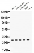Western blot: 40 µg of MCF-7, MDA-MB-231, MDA-MB-453, SKOV and HeLa cell lysates stained with ARG58824 anti-XBP1 antibody at 0.5 µg/ml dilution.