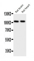 Western blot: Rat brain and Rat heart lysates stained with ARG59889 anti-ZO3 antibody.