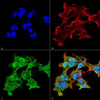 Immunofluorescence: Human Neuroblastoma cell line SK-N-BE. Fixation: 4% Formaldehyde for 15 min at RT. Primary Antibody: ARG22215 anti-alpha A Crystallin antibody [1H3.B8] at 1:100 for 60 min at RT. Secondary Antibody: Goat anti-Mouse ATTO 488 at 1:100 for 60 min at RT. Counterstain: Phalloidin Texas Red F-Actin stain; DAPI (blue) nuclear stain at 1:1000, 1:5000 for 60min RT, 5min RT. Magnification: 60X. (A) DAPI (blue) nuclear stain. (B) Phalloidin Texas Red F-Actin stain. (C) ARG22215 anti-alpha A Crystallin antibody [1H3.B8]. (D) Composite.
