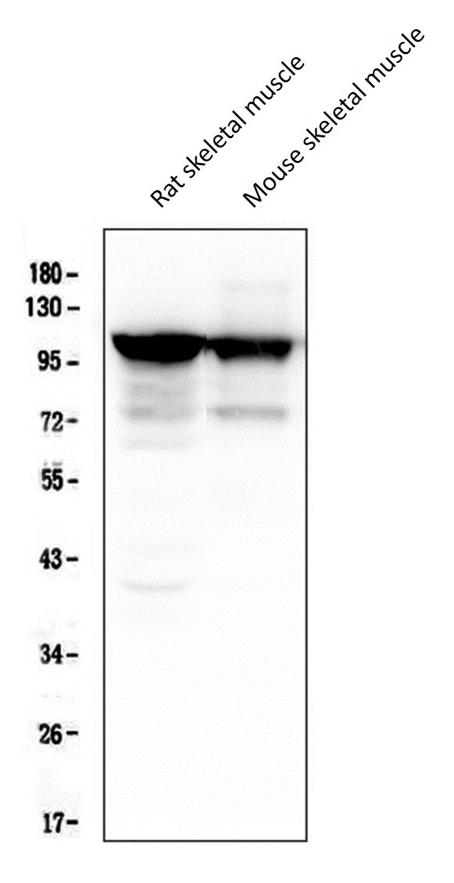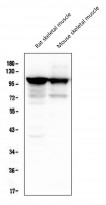 Western blot: 50 µg of samples under reducing conditions. Rat skeletal muscle and Mouse skeletal muscle lysates stained with ARG40285 anti-alpha Actinin 3 antibody [9B5] at 0.5 µg/ml, overnight at 4°C.