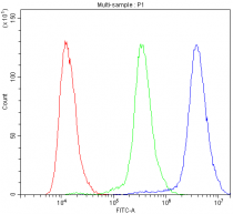 Flow Cytometry: WISH cells were blocked with 10% normal goat serum and then stained with ARG40278 anti-alpha Actinin 3 antibody (blue) at 1 µg/10^6 cells for 30 min at 20°C, followed by incubation with DyLight® 488 labelled secondary antibody. Isotype control antibody (green) was Rabbit IgG (1 µg/10^6 cells) used under the same conditions. Unlabelled sample (red) was also used as a control.