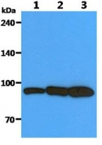 Western blot: 40 µg of 1) PC-3 cell lysate, 2) Balb/3T3 cell lysate, 3) A549 cell lysate stained with ARG57053 anti-alpha Actinin antibody [1D10] at 1:1000.