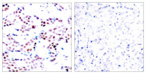 Immunohistochemistry: Paraffin-embedded Human breast carcinoma tissue stained with ARG51525 anti-c-Jun phospho (Thr91) antibody (left) or the same antibody preincubated with blocking peptide (right).