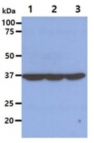 Western blot: 40 µg of 1) HeLa, 2) Jurkat, and 3) NIH-3T3 cell lysates stained with ARG57111 anti-eIF2 alpha antibody [5E10] at 1:1000.