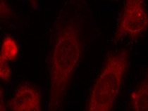 Immunofluorescence: methanol-fixed HeLa cells stained with ARG51760 anti-eIF2 alpha phospho (Ser51) antibody.
