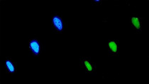 Immunofluorescence: HeLa cells were blocked with 10% goat serum and then stained with ARG42704 anti-eIF2B alpha antibody (green) at 5 µg/ml dilution, overnight at 4°C. DAPI (blue) for nuclear staining.
