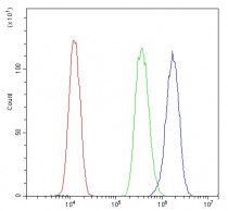 Flow Cytometry: U87 cells were blocked with 10% normal goat serum and then stained with ARG58802 anti-hnRNP F antibody (blue) at 1 µg/10^6 cells for 30 min at 20°C, followed by incubation with DyLight®488 labelled secondary antibody. Isotype control antibody (green) was rabbit IgG (1 µg/10^6 cells) used under the same conditions. Unlabelled sample (red) was also used as a control.