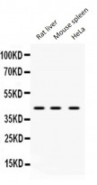 Western blot: Rat liver, Mouse spleen and HeLa lysates stained with ARG58802 anti-hnRNP F antibody at 0.5 µg/ml dilution.