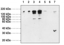 Western blot: 1) 0.005 µg of nNOS recombinant protein, 2) 0.01 µg of nNOS recombinant protein, 3) 0.05 µg of nNOS recombinant protein, 4) 0.1 µg of nNOS recombinant protein, 5) 0.1 µg of iNOS recombinant protein, 6) 0.1 µg of eNOS recombinant protein, and 7) 30 µg of Mouse brain soluble membrane stained with ARG56510 anti-nNOS antibody.