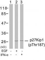 Western blot: Extracts from HeLa cells untreated or treated with EGF, IFN-a stained with ARG51699 anti-p27 Kip1 phospho (Thr187) antibody.