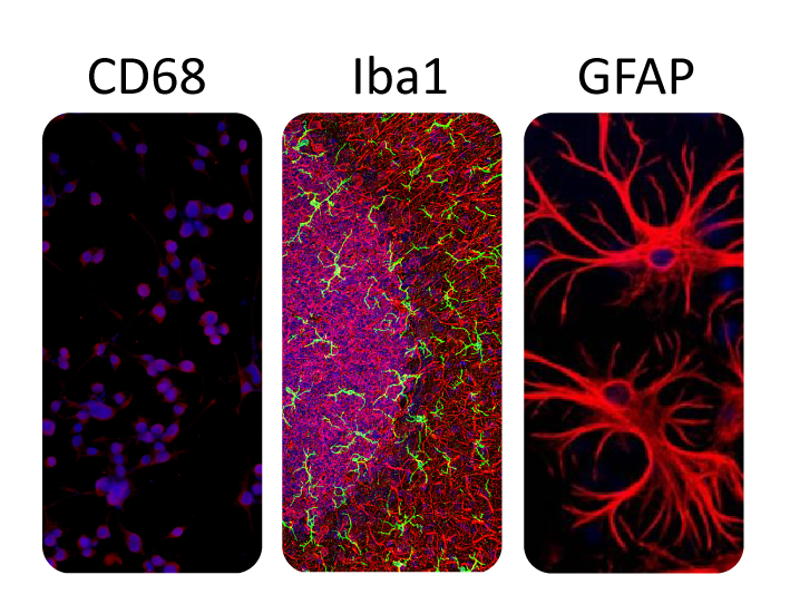 Benefits● Includes microglial markers Iba1 and CD68 antibodies ● Includes astrocyte marker GFAP antibody ● Ideal for triple staining ● Works on human, mouse and rat samples |