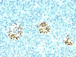 • Specificity: Twenty human keratins are resolved with two-dimensional gel electrophoresis into acidic (pI <5.7) and basic (pI >6.0) subfamilies. This pan keratin antibody cocktail recognizes acidic (Type I or LMW) and basic (Type II or HMW) cytokeratins, which include CK1, CK3-6, CK8, CK10, CK14-16, and CK19.